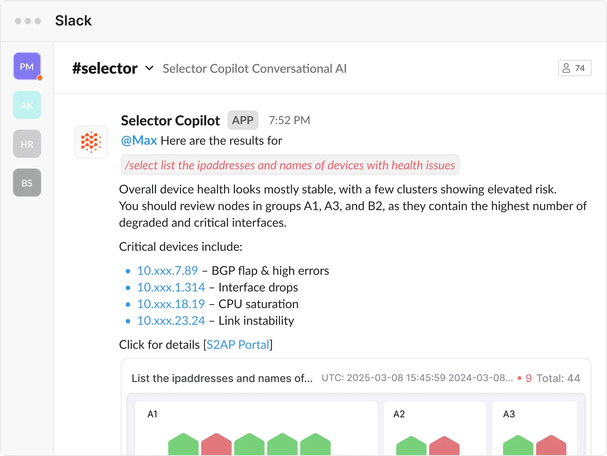 Selector Copilotは単なるインシデントのトリアージにとどまりません。リアルタイムかつデータ主導のコラボレーションを通じて、設計の検証、キャパシティの予測、ネットワークの回復力強化を支援します。